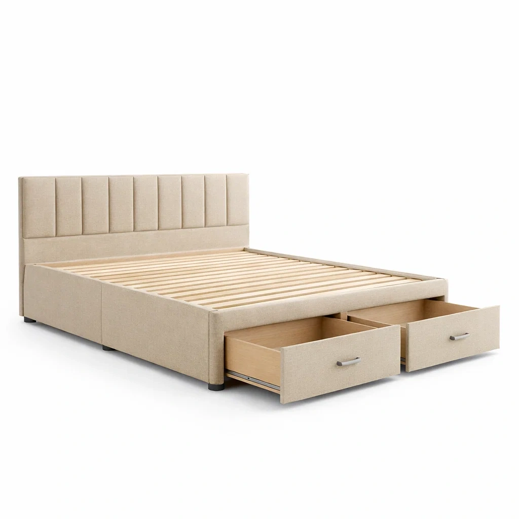 Lit avec rangement en bois et tissu beige avec tiroirs